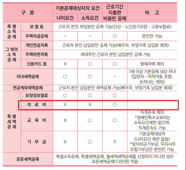 의료비는 연간 총 급여액 3%를 초과하는 경우 그 공제대상금액의 15% 공제(난임시술비 30%, 미숙아,선천성이상아 의료비 20%공제)