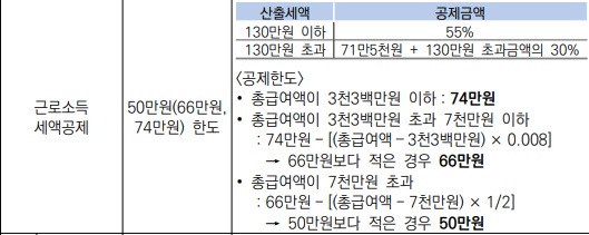 근로소득자라면 총급여별로 소득공제가 차등적용됩니다. 총 급여액 3300만 원 이하 74만 원, 7천만 원 이하 66만 원, 그 외 50만 원의 소득세액공제가 적용됩니다.