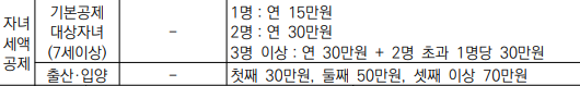 7세이상 자녀가 2명 이하 1명당 15만 원, 2명 초과 시 1명당 30만 원이 적용되며, 해당 과세기간에 출산, 입양한 자녀가 첫째인 경우 30만 원, 둘째인 경우 50만 원, 셋째인 경우 70만 원의 세액공제가 됩니다.