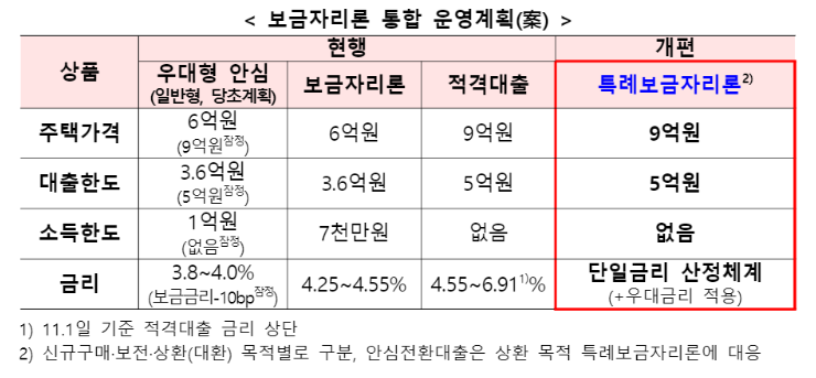 특례보금자리론은 작년에 한시적 운영했던 안심전환대출 + 보금자리론 + 적격대출을 통합한 상품으로 2023년 1년간 한시적으로 통합하여 운영하는 상품입니다. 이번 특례보금자리론은 안심전환대출, 보금자리론 보다 대폭 완화되어 많은 차주들이 혜택을 볼 수 있을 전망입니다.