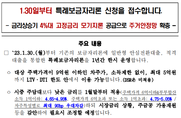 작년부터 계속 된 금리상승으로 주택시장이 얼어붙었는데요. 정부에서는 특례보금자리론 상품 출시를 예고하며 고금리 상황 속에서 주택구입 기회를 마련했습니다. 2023년 1년간 한시적으로 운영될 특례보금자리론에 대한 세부지침이 발표되었습니다.