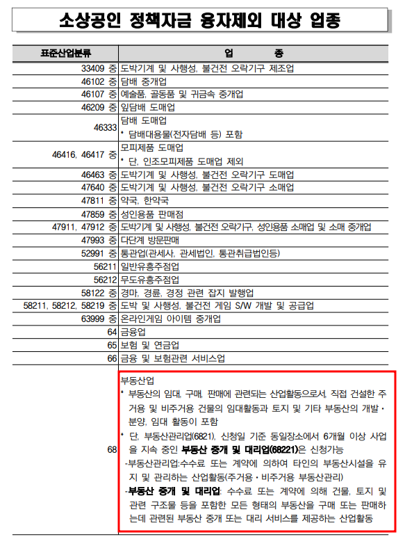 아래 업종에 해당할 경우 소상공인 정책자금에서 제외됩니다. 단 부동산 중개업은 해당 주소지에서 6개월이상 사업을 지속하였을경우 예외로 정책자금을 받을 수 있습니다.